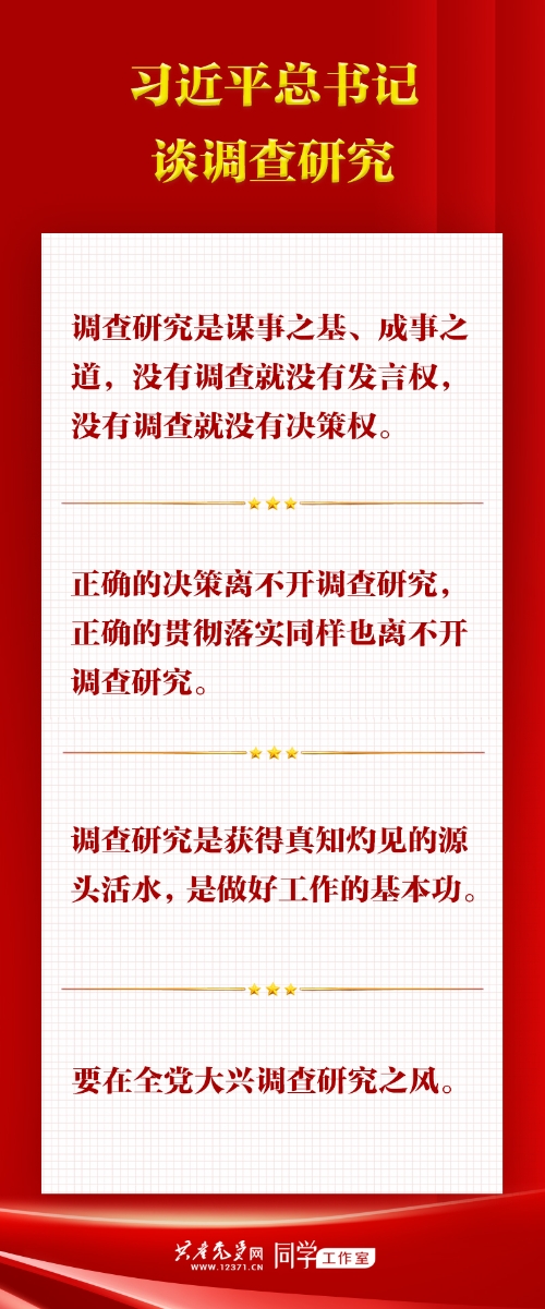 中共中央辦公廳近日印發《關于在全黨大興調查研究的工作方案》。方案指出,黨中央決定,在全黨大興調查研究,作為在全黨開展的主題教育的重要內容,推動全面建設社會主義現代化國家開好局起好步。 黨的十八大以來,以習近平同志為核心的黨中央高度重視調查研究工作,習近平總書記在不同場合就開展調查研究發表了一系列重要講話,深刻闡明了調查研究的極端重要性,為全黨大興調查研究、做好各項工作提供了根本遵循。 ●調查研究必須堅持黨的群眾路線 要重視調查研究,堅持眼睛向下、腳步向下,了解基層群眾所思、所想、所盼,使改革更接地氣。 ——2016年2月23日,習近平在主持召開中央全面深化改革領導小組第二十一次會議時的講話 要拜人民為師、向人民學習,放下架子、撲下身子,接地氣、通下情,深入開展調查研究,解剖麻雀,發現典型,真正把群眾面臨的問題發現出來,把群眾的意見反映上來,把群眾創造的經驗總結出來。 ——2019年3月1日,習近平在中央黨校(國家行政學院)中青年干部培訓班開班式上的講話 要堅持到群眾中去、到實踐中去,傾聽基層干部群眾所想所急所盼,了解和掌握真實情況,不能走馬觀花、蜻蜓點水,一得自矜、以偏概全。 ——2020年10月10日,習近平在中央黨校(國家行政學院)中青年干部培訓班開班式上的講話 ●調查研究必須堅持實事求是 要把調查研究作為基本功,堅持從實際出發謀劃事業和工作,使想出來的點子、舉措、方案符合實際情況。 ——2015年1月12日,習近平在同中央黨校縣委書記研修班學員座談時的講話 要深入開展調查研究,摸清情況,找到癥結,做到心中有數,不能拍腦袋決策,真正把功夫下到察實情、出實招、辦實事、求實效上。 要了解實際,就要掌握調查研究這個基本功。要眼睛向下、腳步向下,經常撲下身子、沉到一線,近的遠的都要去,好的差的都要看,干部群眾表揚和批評都要聽,真正把情況摸實摸透。 ——2021年9月1日,習近平在中央黨校(國家行政學院)中青年干部培訓班開班式上的講話 ●調查研究必須堅持問題導向 加強對重大改革問題的調研,盡可能多聽一聽基層和一線的聲音,盡可能多接觸第一手材料,做到重要情況心中有數。 ——2014年1月22日,習近平在主持召開中央全面深化改革領導小組第一次會議時的講話 既要“身入”基層,更要“心到”基層,聽真話、察真情,真研究問題、研究真問題,不能搞作秀式調研、盆景式調研、蜻蜓點水式調研。 ——2021年9月1日,習近平在中央黨校(國家行政學院)中青年干部培訓班開班式上的講話 要聚焦構建新發展格局、落實“兩個毫不動搖”、扎實推進共同富裕等重大問題,深入開展調查研究,積極建言獻策。 ——2023年1月16日,習近平在同黨外人士座談并共迎新春時的講話 ●調查研究必須堅持攻堅克難 既要到工作局面好和先進的地方去總結經驗,又要到困難較多、情況復雜、矛盾尖銳的地方去研究問題,特別是要多到群眾意見多的地方去,多到工作做得差的地方去,既要聽群眾的順耳話,也要聽群眾的逆耳言,這樣才能聽到實話、察到實情、收到實效。 ——2017年10月25日,習近平在黨的十九屆一中全會上的講話 調查研究要注重實效,使調研的過程成為加深對黨的創新理論領悟的過程,成為保持同人民群眾血肉聯系的過程,成為推動事業發展的過程。要防止為調研而調研,防止搞“出發一車子、開會一屋子、發言念稿子”式的調研,防止扎堆調研、“作秀式”調研。 ——2019年5月31日,習近平在“不忘初心、牢記使命”主題教育工作會議上的講話 要大興調查研究之風,多到分管領域的基層一線去,多到困難多、群眾意見集中、工作打不開局面的地方去,體察實情、解剖麻雀,全面掌握情況,做到心中有數。 ——2022年12月26日至27日,習近平在主持召開中央政治局民主生活會時的講話 ●調查研究必須堅持系統觀念 我們一方面要加強調查研究,準確把握客觀實際,真正掌握規律;另一方面要堅持發展地而不是靜止地、全面地而不是片面地、系統地而不是零散地、普遍聯系地而不是單一孤立地觀察事物,妥善處理各種重大關系。 ——2015年1月23日,習近平在十八屆中央政治局第二十次集體學習時的講話 要抓住能夠帶動五大發展理念貫徹落實的重點工作,統籌推動五大發展理念貫徹落實。對每個發展理念,也要抓住重點,以抓重點推動每個理念在實踐中取得突破。這就要求我們進行深入的調查研究,既總體分析面上的情況,又深入解剖麻雀,提出可行的政策舉措和工作方案。 ——2016年1月29日,習近平在十八屆中央政治局第三十次集體學習時的講話 對調研得來的大量材料和情況,要認真研究分析,由此及彼、由表及里。對經過充分研究、比較成熟的調研成果,要及時上升為決策部署,轉化為具體措施;對尚未研究透徹的調研成果,要更深入地聽取意見,完善后再付諸實施;對已經形成舉措、落實落地的,要及時跟蹤評估,視情況調整優化。 ——2020年10月10日,習近平在中央黨校(國家行政學院)中青年干部培訓班開班式上的講話 要在深入分析思考上下功夫,去粗取精、去偽存真,由此及彼、由表及里,找到事物的本質和規律,找到解決問題的辦法。 ——2021年9月1日,習近平在中央黨校(國家行政學院)中青年干部培訓班開班式上的講話